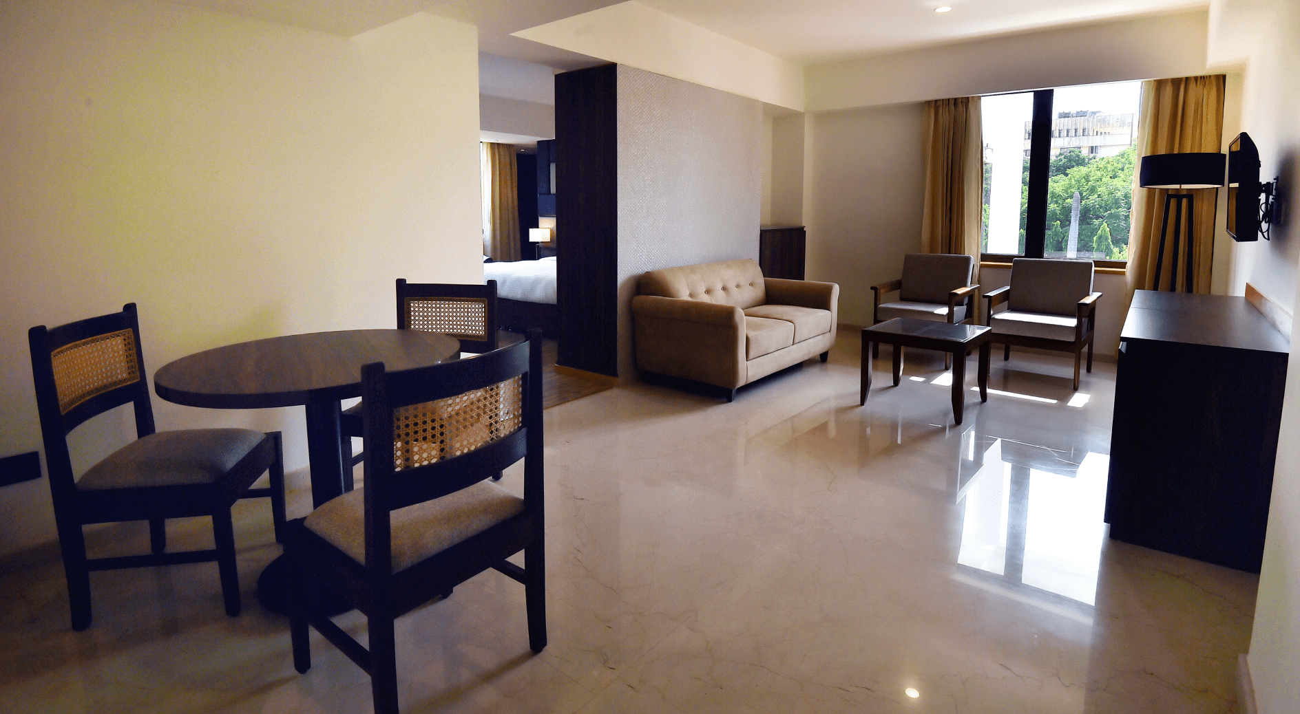 A suite room offers extra space and added comfort for guests who prefer a more relaxed and private stay. It usually includes a king-size bed with soft, high-quality linen and a separate living area where you can sit and unwind. The room is equipped with televisions, a mini bar, a tea and coffee maker, and high-speed internet for your convenience. You will also find universal plug points, an electronic safe, and a telephone. Thoughtfully selected bathroom and designer room amenities add to the comfort. With in-room service available, a suite room makes your stay feel spacious and comfortable.
